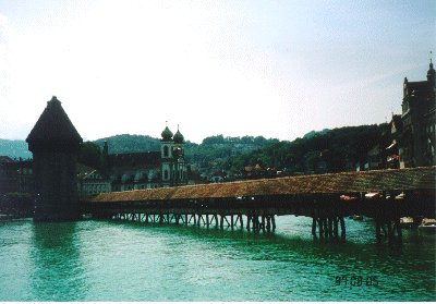 チューリッヒを12:01分発の電車に乗りルツェルンへと向かう。12:50分頃ルツェルンに着き荷物をロッカーに入れた後、観光に行く。ホフ教会はなかなか良かったが、その後にいったライオン記念碑と氷河公園はそれほど大したことはなかった。氷河公園は学割があって7SF->5SFになった。ちょっと休憩するために近くのカフェに入り、コーラを頼んだところレモンのしぼり汁が一緒についてきた。周りの人をちょっと見たらやっぱりコーラにそのレモン果汁を入れていたので、こっちではそうやって飲むらしい。途中のデパートで日本から持ってき忘れたアフターシェーブローションとリップクリームを買う。日本では電気シェーバーを使っているが、旅行中は電源の問題もありかみそりでひげを剃ることにしているのである。よく海外旅行に行くときに何でもかんでも日本から持っていく人がいるが、いざとなったらこっちでもほぼ何でも買えるのでそんなに心配する必要はないと思う。しかもそれ自体が簡単なお土産(もちろん自分用)にもなるのだから。数年前に火事で燃えてしまったという世界最古の木造橋、カペル橋(いまは新しく復元されている)とその近くのシュプロイヤー橋を見たあと、15:45分発の電車でインターラーケンに向かう。で、一番驚いたのはなんといっても"暑い"ということである。太陽が照りつけ、気温も30度を越えているのである。イメージしていたスイスとは大きく違った。