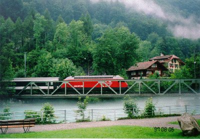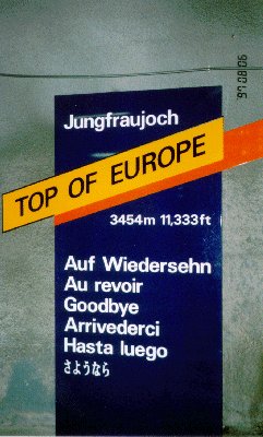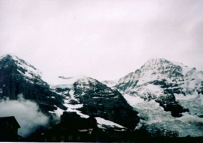 まずBOBに乗ってラウターブルンネンに向かう。途中駅でグリンデルワルト方面と2つに分かれるが、そっちは帰りによることにした。9:00にラウターブルンネンに着く。すぐとなりのホームにクライネ・シャイデック行きの登山電車が待っていて連絡できる。しかし、私たちはその電車には乗らずにシュタウプバッハの滝を見に行くことにした。この滝は駅からも見えるのですぐ近くかと思ったが、ふもとまで行くのに15分ぐらいかかった。途中こんなものを見つける。9:45分ラウターブルンネン発のWABに乗り、10:00にウェンゲンに着く。そのままこの電車に乗ってクライネ・シャイデックに向かう。10:32分にクライネ・シャイデック駅に到着する。10:30発の電車がいったばかりだったので、つぎの11:00発のJBに乗ることにする。今日は雲がかかっていて、アルプスの山々もその雲によって見え隠れするような感じでちょっと残念である。しかも、ユングフラウから戻ってきた電車にはなんと30人ぐらいの日本人団体が二組もあったのである。乗っていた人の8割近くが日本人というちょっと怖い光景であった。しかも、ここクライネ・シャイデックの売店には、"日本茶"、"おにぎり"、"しそおにぎり"なんていう紙が張ってあり、参ってしまった。確かにインターラーケンにも"うどん"、"ラーメン"なんていうのぼりはあったが、まさかこんなところにまであるとは思ってもいなかった。
