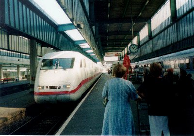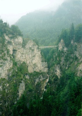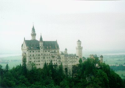 10:12分発のICE691は日曜日のせいか、がらがらであった。そのため4人席を一人で占有できとても快適であった。このICEでアウグスブルクまで行き、12:03分アウグスブルク発フュッセン行きのREに乗り換える。今日のユースは、昨日ギゼラさんに頼んで電話で予約しておいてもらったので安心である。フュッセンに2時頃着き、例のごとく荷物を駅のロッカーに預け、14:15分のバスに乗ってホーエンシュヴァンガウに行く。バス停から歩いて20分ぐらいでノイシュヴァンシュタイン城に着いた。城より100mぐらい手前にチケット売場があるのだが、20~30人ぐらい並んでいて、まぁこんなもんかなぁと思う程度だった。しかしそこから歩いて城の入り口に行くと、なんと人、人、人である。しかもガイドの言語ごとに列を作って並んでいるのである。ドイツ語の列に並んでいる人が全体の半数ぐらいで、次に英語、そのほか日本語、フランス語とイタリア語が同じ人数ぐらい並んでいた。それでも運良く15分待ちぐらいで中にはいることができた。しかし、係りの人の手違いか何かで、前に入ったフランス語のグループと一緒になってしまい、結局フランス語のガイドテープしか流れないまま見学するはめになってしまった。城の内部は思っていたほどすごいものではないと思う。というかノイシュヴァンシュタイン城はやはり外見のイメージが強く、そのイメージのまま内部を見学すると"思っていたほど大したことない"という結論になるのである。