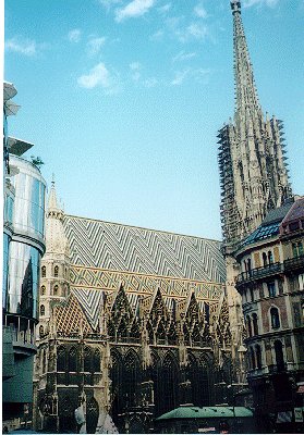次にウィーンのシンボルであるシュテファン大聖堂に向かう。トラムの路線図が手に入らなかったので結局結構歩いていき、最後に一駅分だけU-Bahnにのる。外壁の大部分が修理中でちょっと残念だったが、中は結構すごかった。上に登るのに、地球の歩き方には階段だと20AS、エレベータだと40ASとかかれていたが、階段の方は改修中らしく登れないので、しょうがなくエレベータで上まで行く。大聖堂自体の方がまだ高いため360度パノラマというわけにはいかないが、Wienの街を一望できなかなか眺めはよい。また、このシュテファン大聖堂は地下にあるカタコンベが有名らしいが、残金があまりないことに気づき断念する。その後、Wien一にぎやかといわれるケルントナー通りを通って国立オペラ劇場まで行き、王宮や美術史博物館のある方へと向かう。美術史博物館もあまり興味がないし、お金もなかったので、ただで見れるマリアテレジア像を見て済ます。王宮にも行くがこれも外から見ただけ。