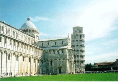 Pisaの斜塔は本当に傾いていた。しかも予想以上の傾きである。裏側に倒れるのを防ぐために重しなどがしてあるのが何とも痛ましい。周りにはおみやげ屋さんがいっぱいあり、ピサの斜塔グッズをいろいろと売っているのはどこの観光地でも同じである。どうでもいいことだが、傾いている方から見ると全然おもしろくない。